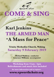 Come and Sing Karl Jenkins – The Armed Man: A Mass for Peace Posted on October 25, 2018 by Jonathan Draper Saturday 9th February 2019, 11am – 5pm Trinity Methodist Church, Woking A stimulating day working on this piece, including vocal workshops with professional singers. Share this:ShareShare on Tumblr Click to share on Reddit (Opens in new window) Reddit Click to share on WhatsApp (Opens in new window) WhatsApp Pocket